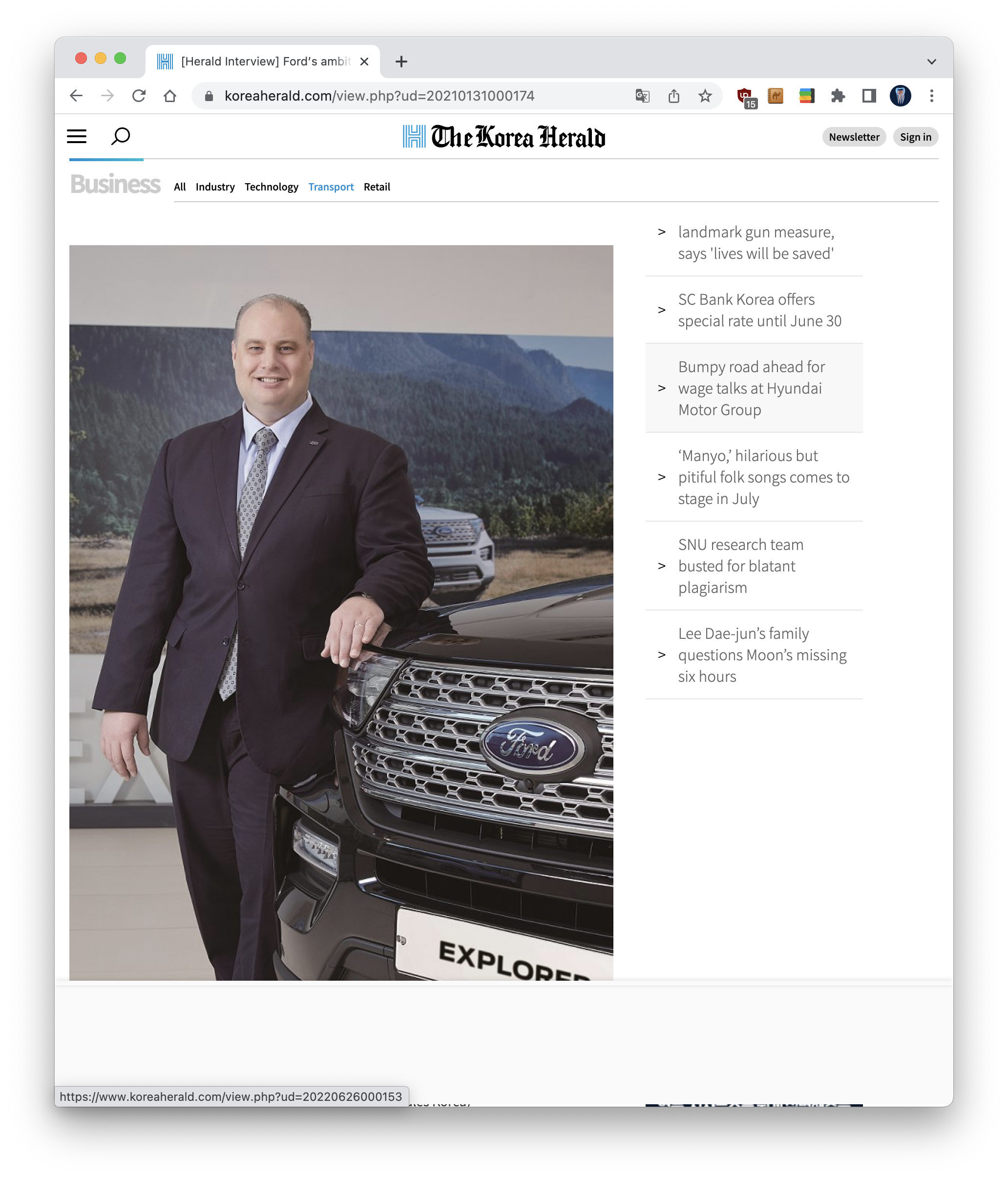 (1) By Jo He-rim, [Herald Interview] Ford’s ambition to become ‘American vehicle of choice’, The Korea Herald, Jan 31, 2021 - 16:37 : https://www.koreaherald.com/view.php?ud=20210131000174