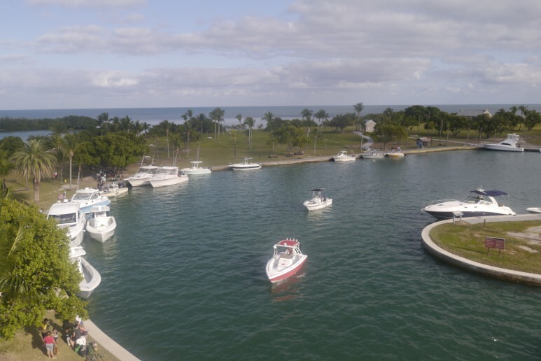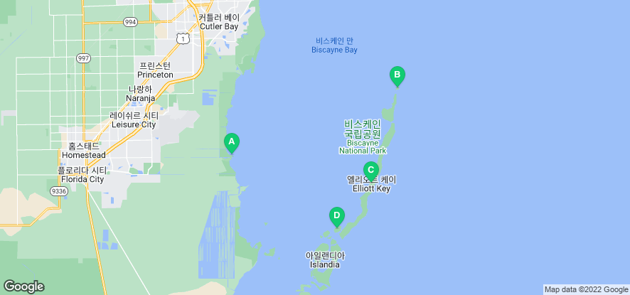 Dante Fascell Visitor Center (A)에는 작은 해양 전시장을 갖춘 선착장입니다. 이 곳에서 몇몇 섬(B, C, D)들을 방문할 수 있는데 Boca Chita Key 보카 치타 키 (B)는 3시간에 걸쳐 다녀올 수 있는 아담한 섬입니다. 이 근방은 20세기 초에 부유한 마이애미 인들의 사교장이었지만 이제는 국립공원이 되었습니다. 그 중 Mark C. Honeywell. 마크 C. 허니웰의 개인 휴양지이었던 Boca Chita Key 보카 치타 키 (B)와 이곳에 있는 등대가 가장 유명합니다. 모래 섬과 산호 섬의 중간 대역으로 해변에는 모래와 산호가 섞여 있습니다.