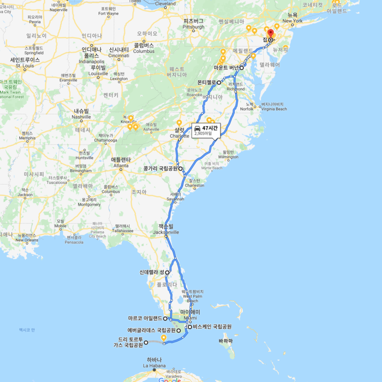 이번 Season 2 국립 공원은 일주일의 Thanksgiving 연휴를 맞이하여 8박 9일을 계획하였습니다. 자녀 학교의 담임 선생님과 교장선생님에게 양해를 구하고 Educational Trip Request Form을 작성해 일주일 연휴에 2일 간의 휴일을 더할 수 있었습니다. 다녀온 길은 조지워싱턴의 사저 마운트 버논, 토머스 재퍼슨의 사저 몽티첼로, 콩가리 국립공원, 올랜도 디즈니 월드, 에버글레이즈 국립공원, 마르코 아일랜드. 비스케인 국립공원, 키웨스트, 드라이 토르투가스 국립공원 순 입니다.