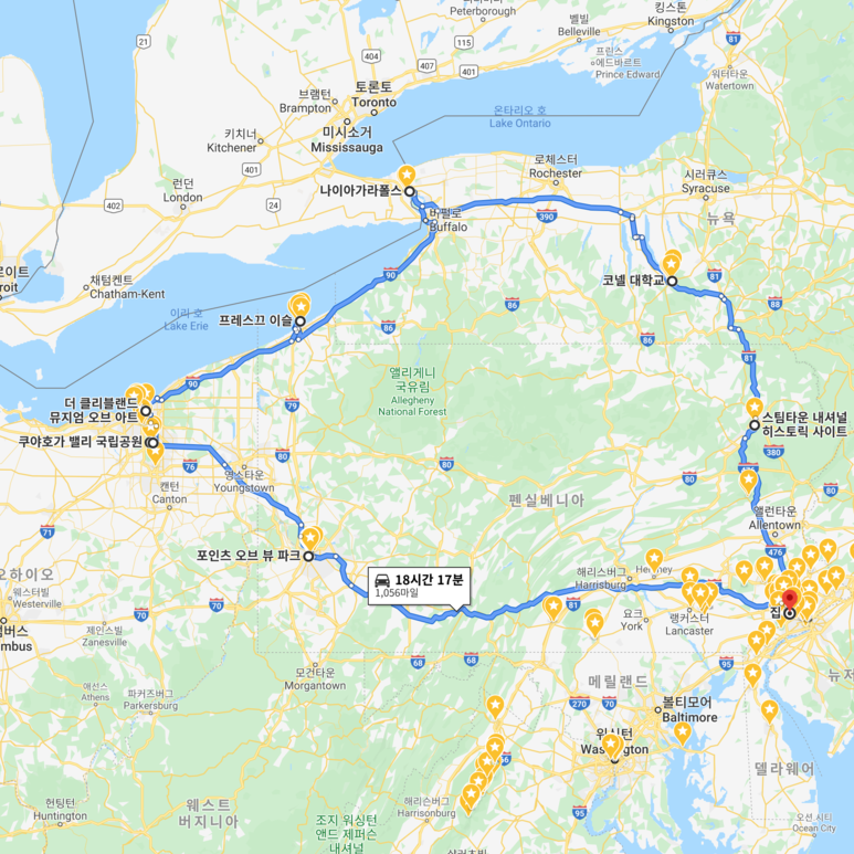 과거 여정은 왕복 여정에 가까웠기 때문에, 이번에는 필라델피아 Philadelphia → 피츠버그 Pittsburg → 쿠야호가 Cuyahoga → 클리브랜드 Cleveland → 이리 Erie → 나이아가라 Niagara Falls → 이타카 Ithaca → 스크랜턴 Scranton → 필라델피아 Philadelphia 를 도는 큰 원을 그렸습니다. 나이아가라 폭포가 보여주는 절경은 쿠야호가 국립공원을 덮고도 남았기에 먼저 쿠야호가를 향했습니다. 하루 운전 시간을 5시간 이내로 제한해 한결 편안한 여정이었습니다. 안전하게 다녀올 수 있도록 힘이 되어준 아내에게 감사의 말을 전합니다. :)