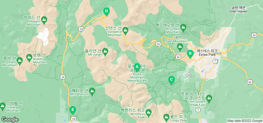 록키마운틴 국립공원(A)은 가장 유명한 Beaver Meadows Visitor Center (B)를 입구 남측으로 Sprague Lake (C) 같은 예쁜 호수들이 많이 있습니다. 피크닉, 낚시 등으로 무척 사람들이 많이 찾으므로 아침 일찍 출발하시거나 공원 내 숙소를 권해드립니다. 산 정상의 Alpine Visitor Center(D)를 넘어 Kawuneeche Visitor Center(E)를 향하는 길이 매우 높고 날씨가 쌀쌀하므로 추위와 배고픔에 대비가 필요합니다.
