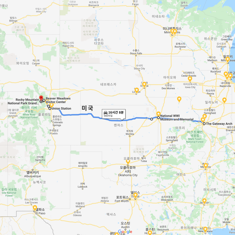 필라델피아 교외에서 출발해 이렇게 왔나 싶은 먼거리. 끊임없는 평원을 달려오니 록키 산맥이 앞을 가로막고 있습니다. 매일 차로 움직여야 하기에, 높은 고도를 오를 때 차가 문제가 생기면 어쩌나 걱정이 깊었는데, Ford F150은 록키 마운틴 국립공원의 Alpine Visitor Center까지 문제없이 달려주었습니다. 아직도 이 차안에서 저 산 너머 아래를 굽어보며 먹던 컵라면 맛을 잊을 수가 없군요.