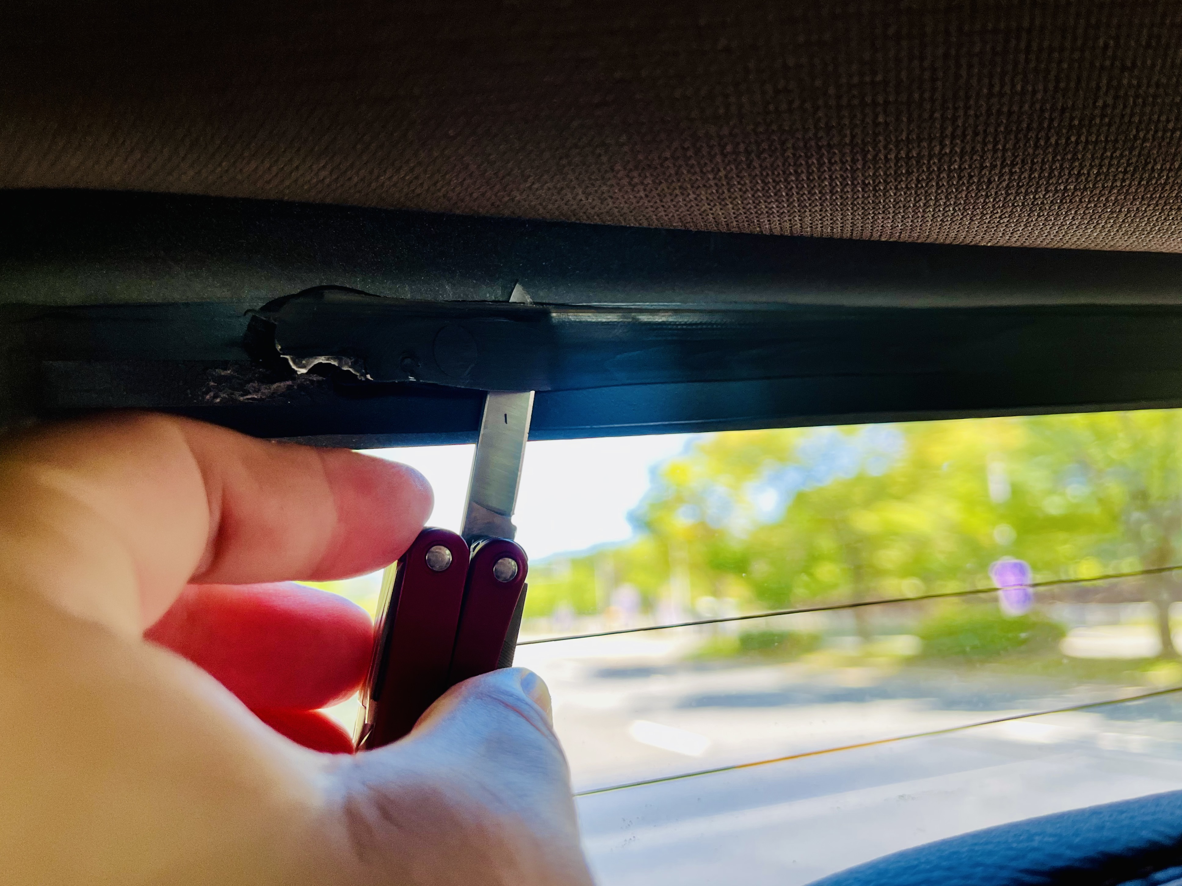 제거하고 나니 유리창 윗단에 우레탄 접착제가 고무처럼 붙어있더군요. 아래처럼 하나하나 칼로 제거하였습니다.