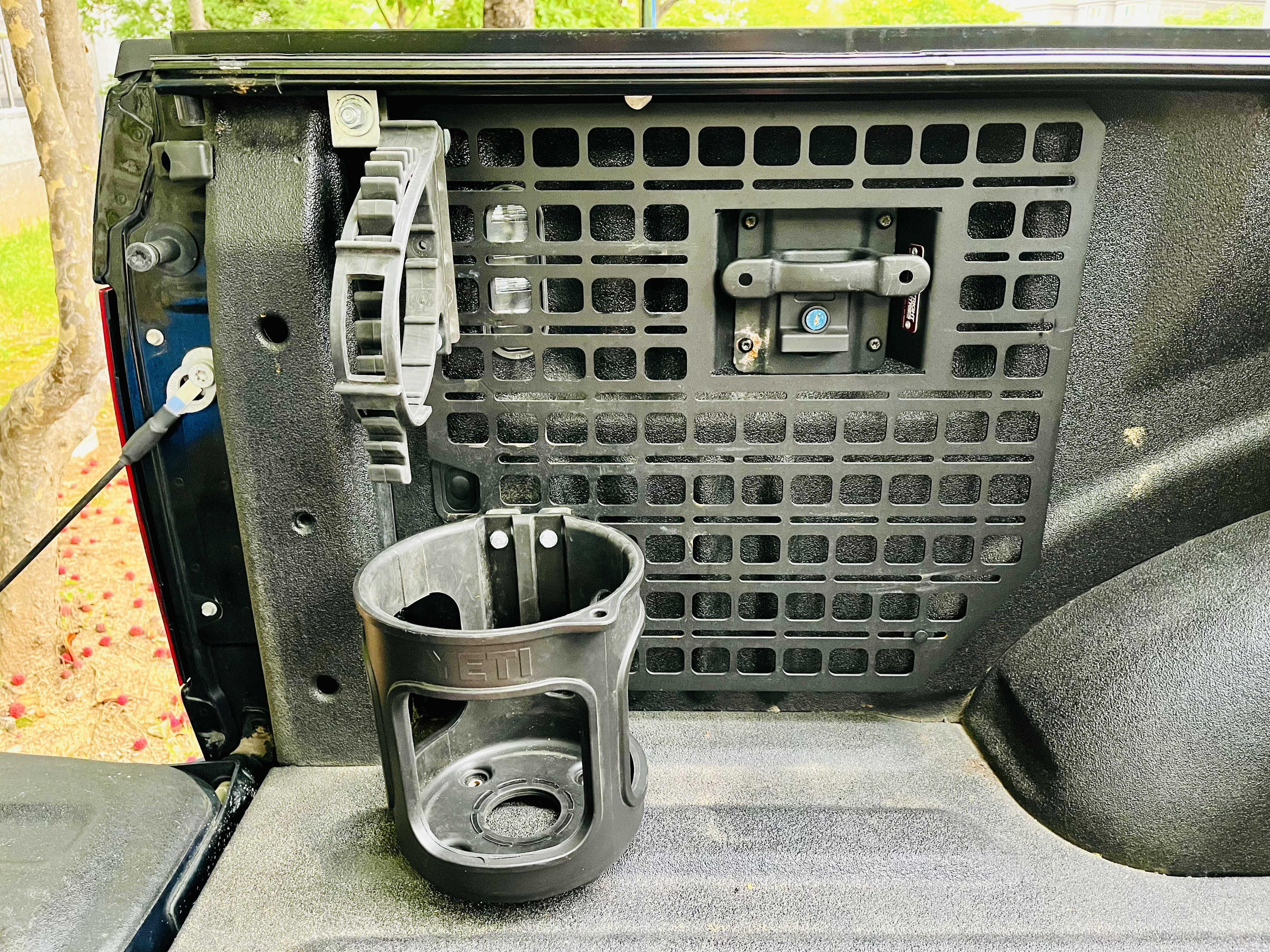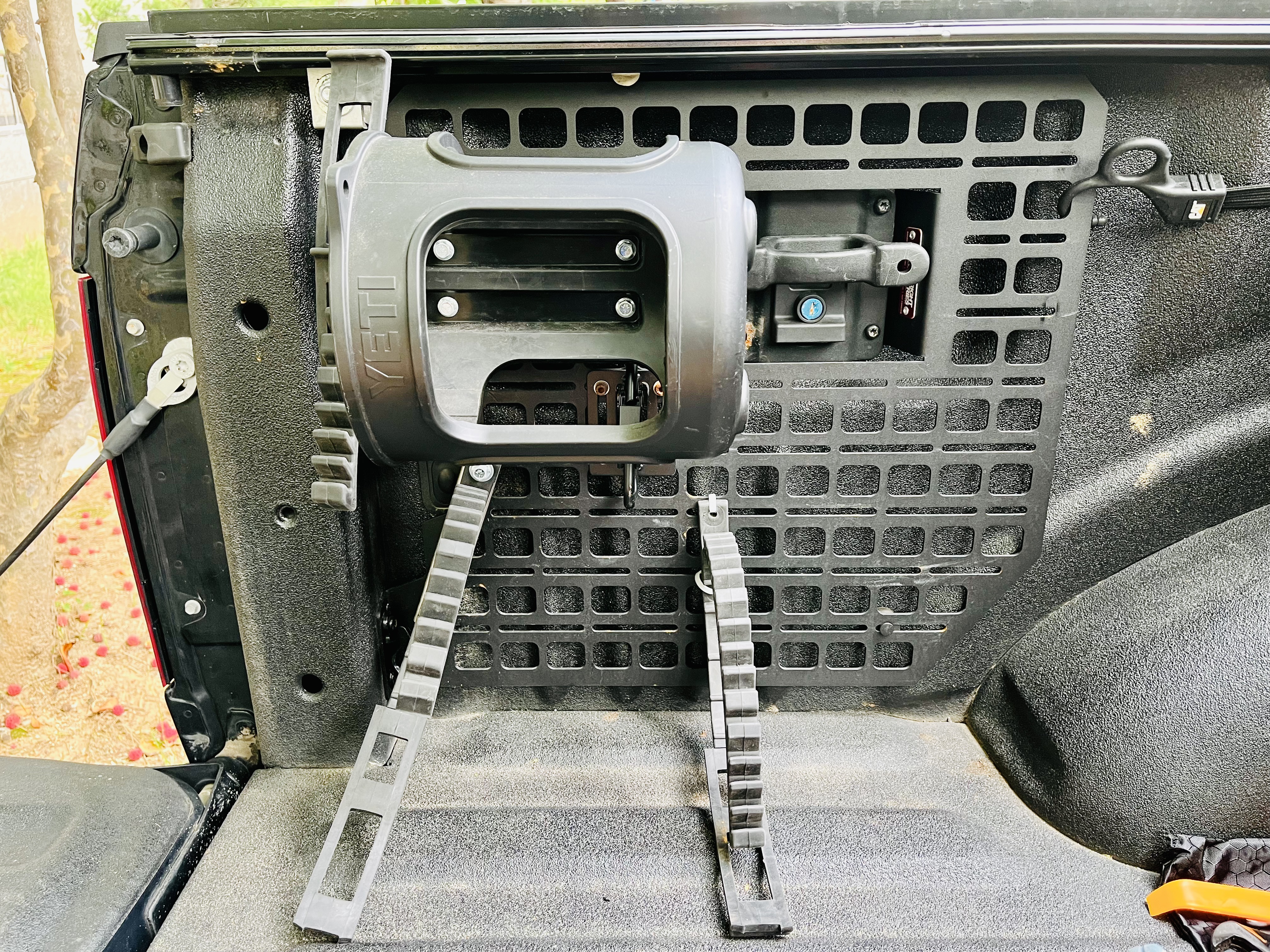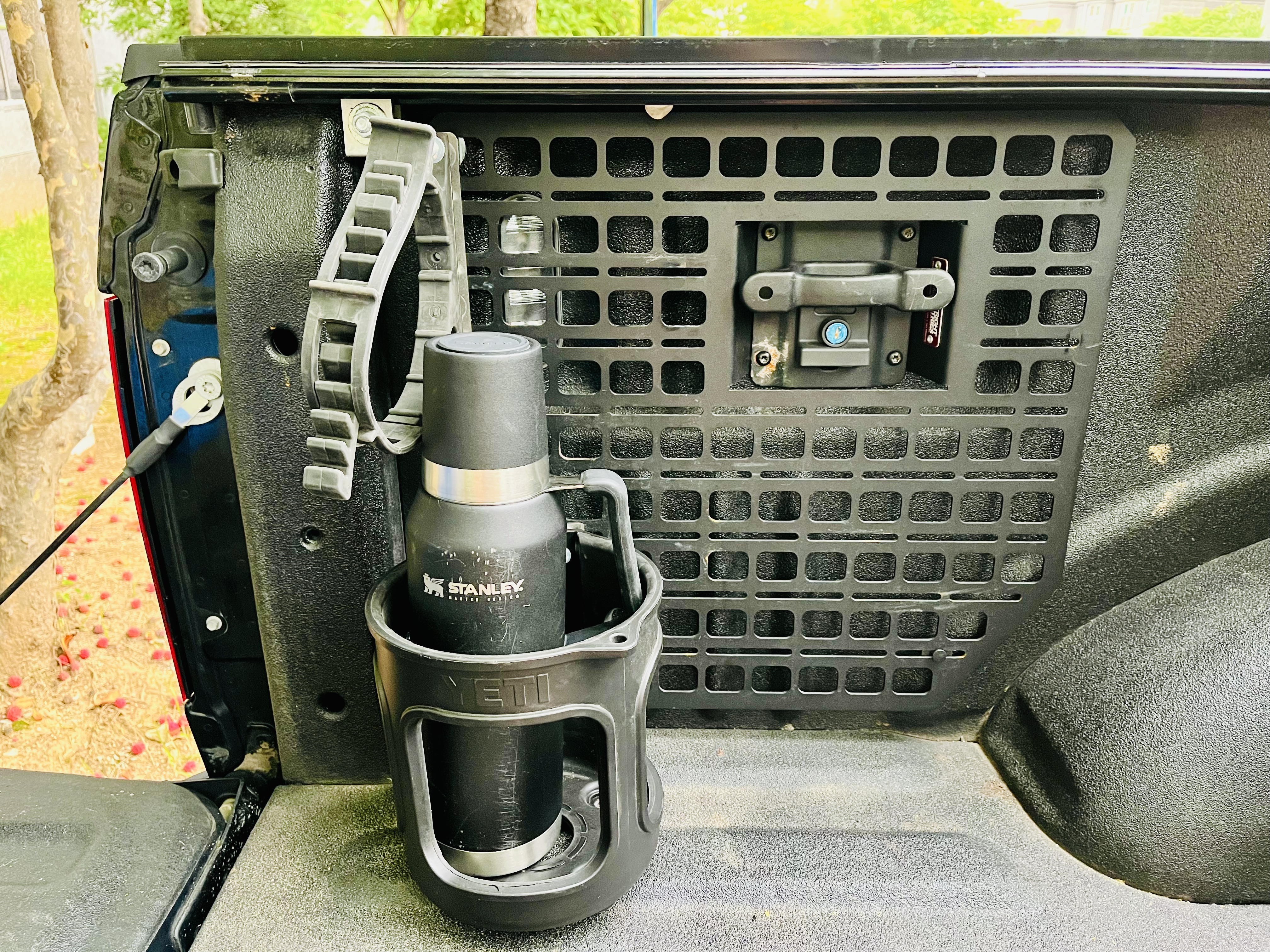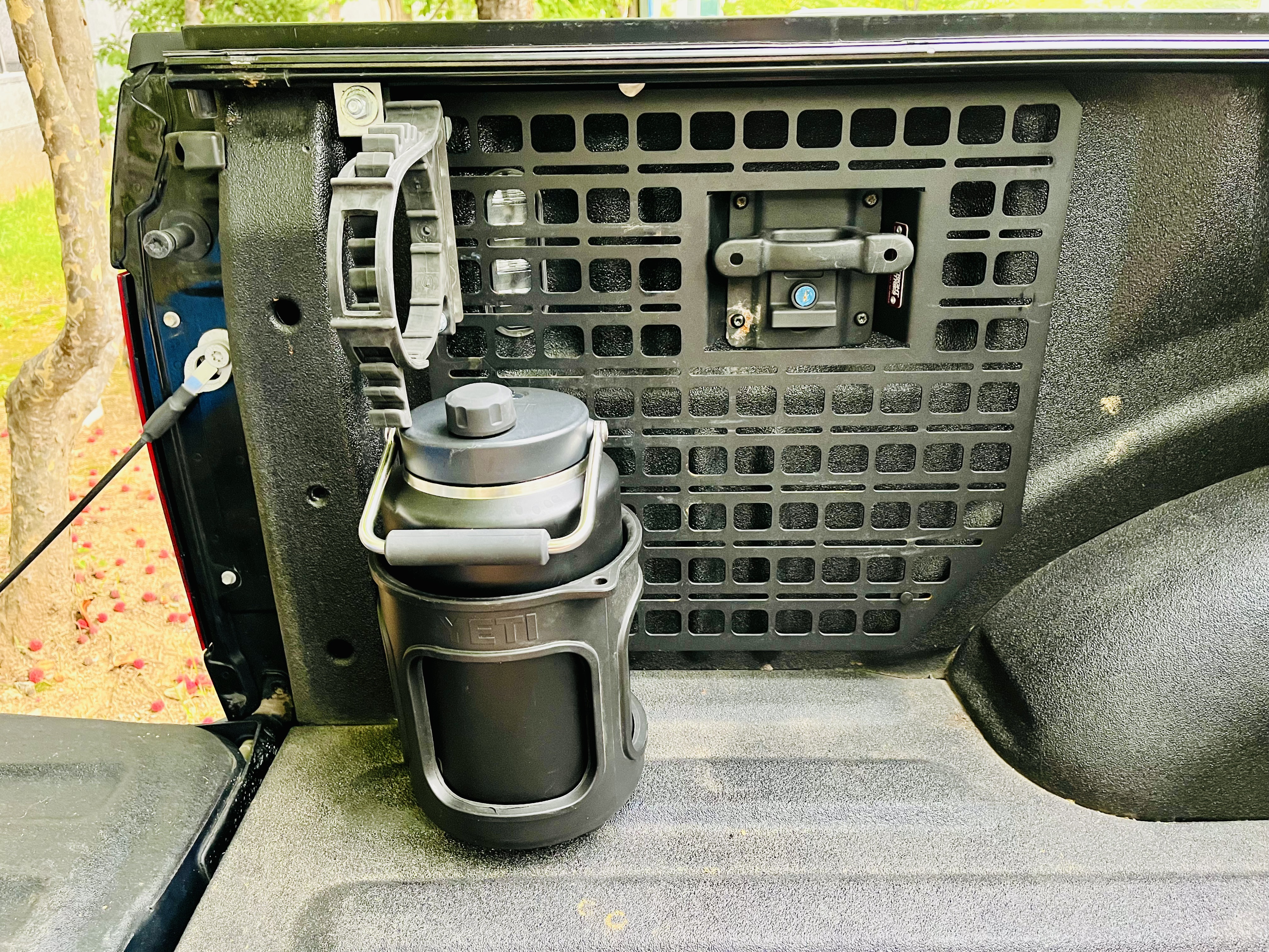 아래는 과거 BuiltRight 트럭 베드 MOLLE (Modular Lightweight Load-carrying Equipment) 패널을 통해 고정해두었던 왼쪽 부위입니다. YETI 저그 마운트를 뉘워 설치했던 이유는 물따르기를 편리하게 하기 위함이었는데, 그다지 실용적이지 않았습니다. 물을 쏟을까 조마조마해졌기 때문에 정립자세로 바꾸는 것이 낫겠다는 생각입니다. 또한 이런 상단 설치는 MOLLE 패널을 고정시키기 위한 나사 체결부가 하단 후방부에 있어 여기에 방해가 되면 패널 설치에 어려움이 있었고, 이 부위에 스탠리 물병을 설치하면 되겠다는 다소 강박적인 구성이이었습니다.