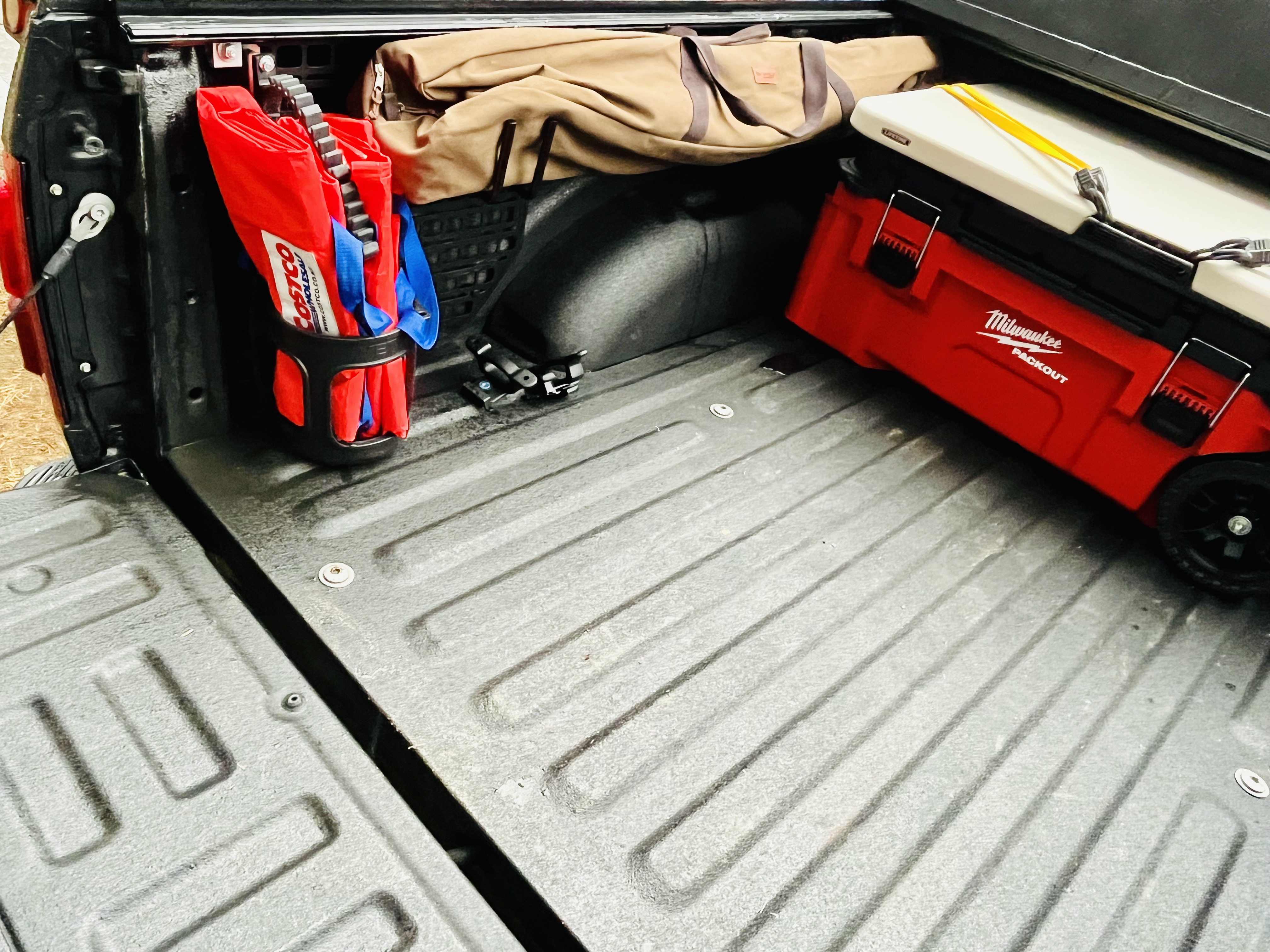내부에 과거 구입한 밀워키 팩아웃 롤링 툴체스트와 라이프타임 폴딩 테이블이 내측에 있고, 예티 버킷은 오른쪽으로 자리를 옮긴 상황이 보이네요. COOLOCK J Hook은 과거 BoxLink에 장착했었던 Tie Down Anchor를 제거한 위치에 장착할 생각입니다.