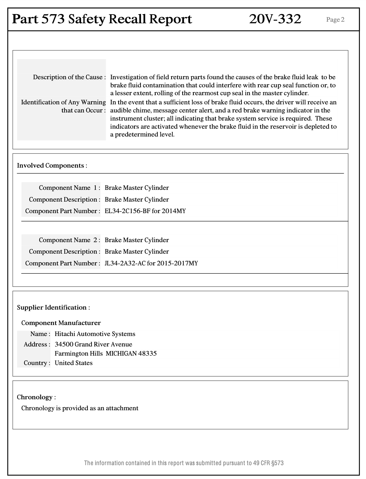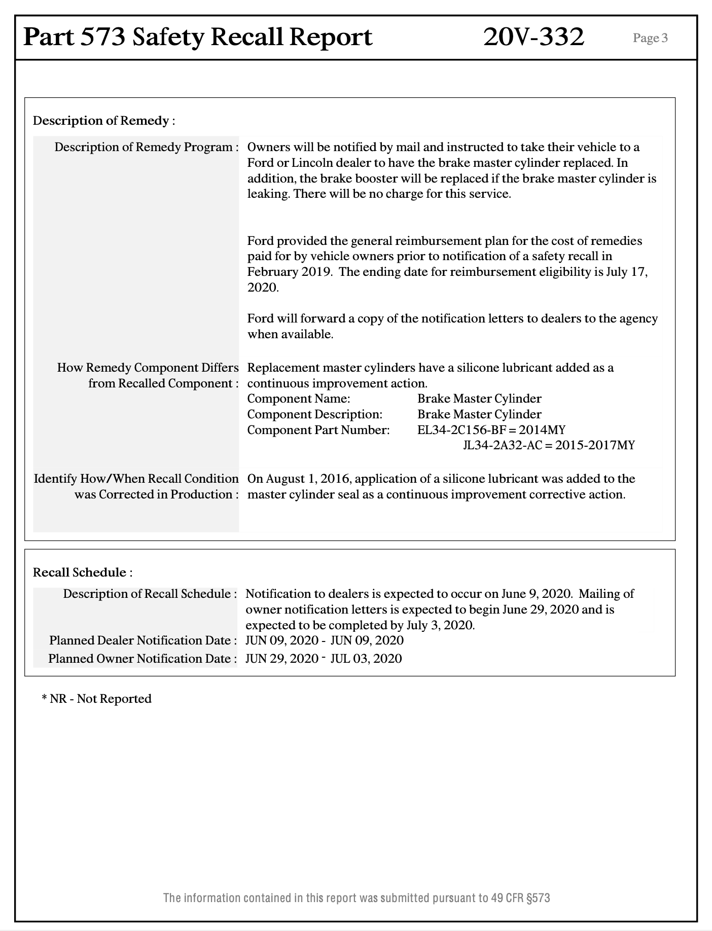 리콜 조치로 포드는 소유자에게 이 사실을 알려, 포드 딜러들은 브레이크 마스터 실린더를 교체(Labor Operation 20S31B)하고 브레이크 부스터를 검사하여 필요에 따라 무상으로 교체(Laber Operation 20S31C)하게 됩니다. 이에 필요한 부품들은 다음과 같습니다.