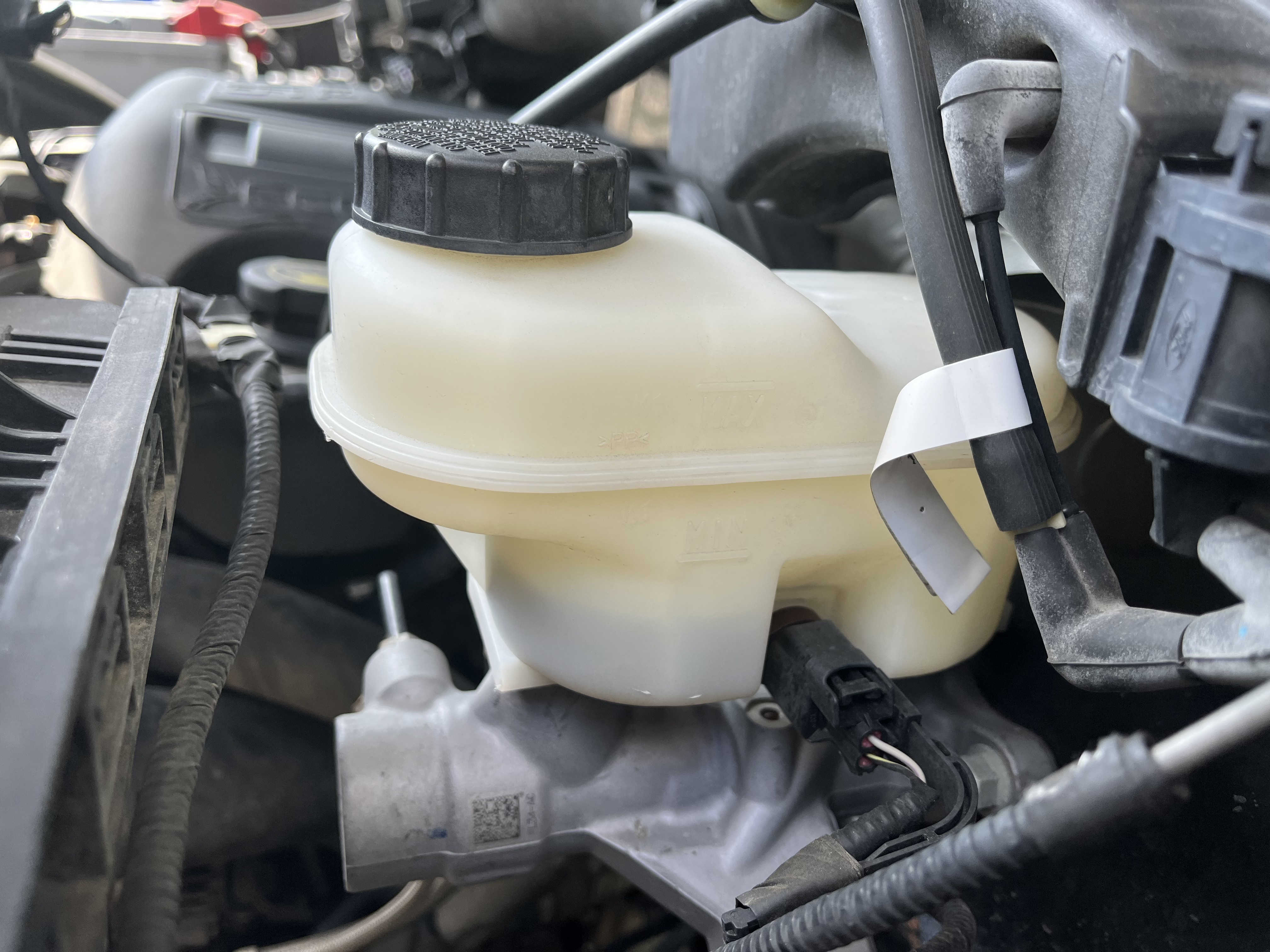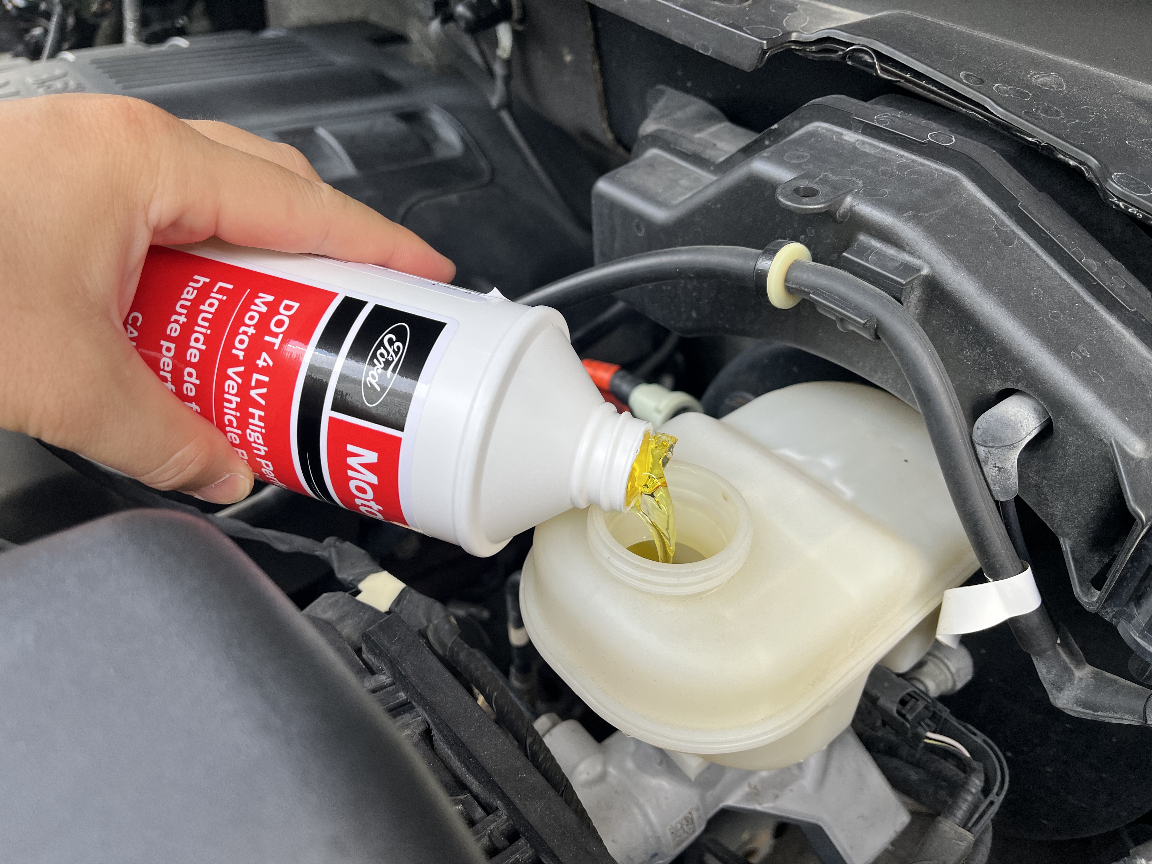 주차 중이던 F150의 브레이크 페달 느낌이 바닥까지 푹 꺼지는 일이 발생했습니다. 브레이크 경고등까지 켜져 놀란 마음에 차량 전방 후드를 열고 브레이크액을 확인한 결과 최저점 이하로 떨어진 것을 확인할 수 있었습니다. 브레이크액이 기준점 이하로 소실된 경우 보통 브레이크 패드 소모 또는 브레이크액 호스가 터져 있는 경우가 많습니다.