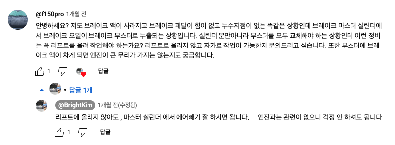 저의 경우 마스터 실린터에서 부스터로 브레이크액이 새고 있는 상황이기 때문에 실린더 뿐만아니라 부스터가 함께 필요한 상황이었습니다. 근처의 포드자동차 서비스점은 F-150을 리프트에 올릴 수 있는 여건이 안되기 때문에, 해당 부분이 리프트를 올려 수리를 해야 하는 상황인지 미국 미캐닉의 교체 영상을 살펴보았습니다.