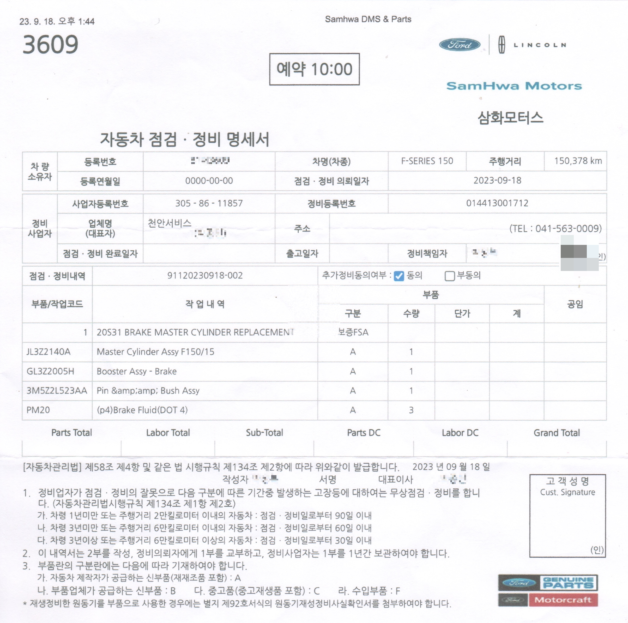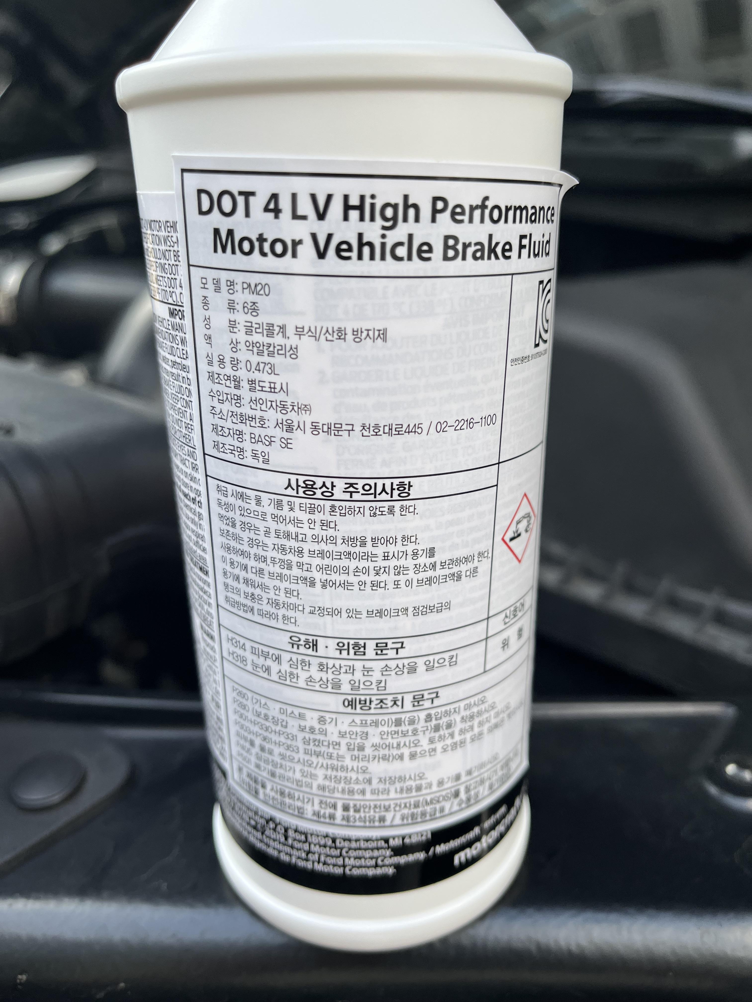 그래서 근방의 포드정비점인 (구)삼화모터스, (현)선인자동차 서비스센터에 방문하여 공식 DOT4 브레이크액 PM-20을 3만 원에 구입하였습니다.