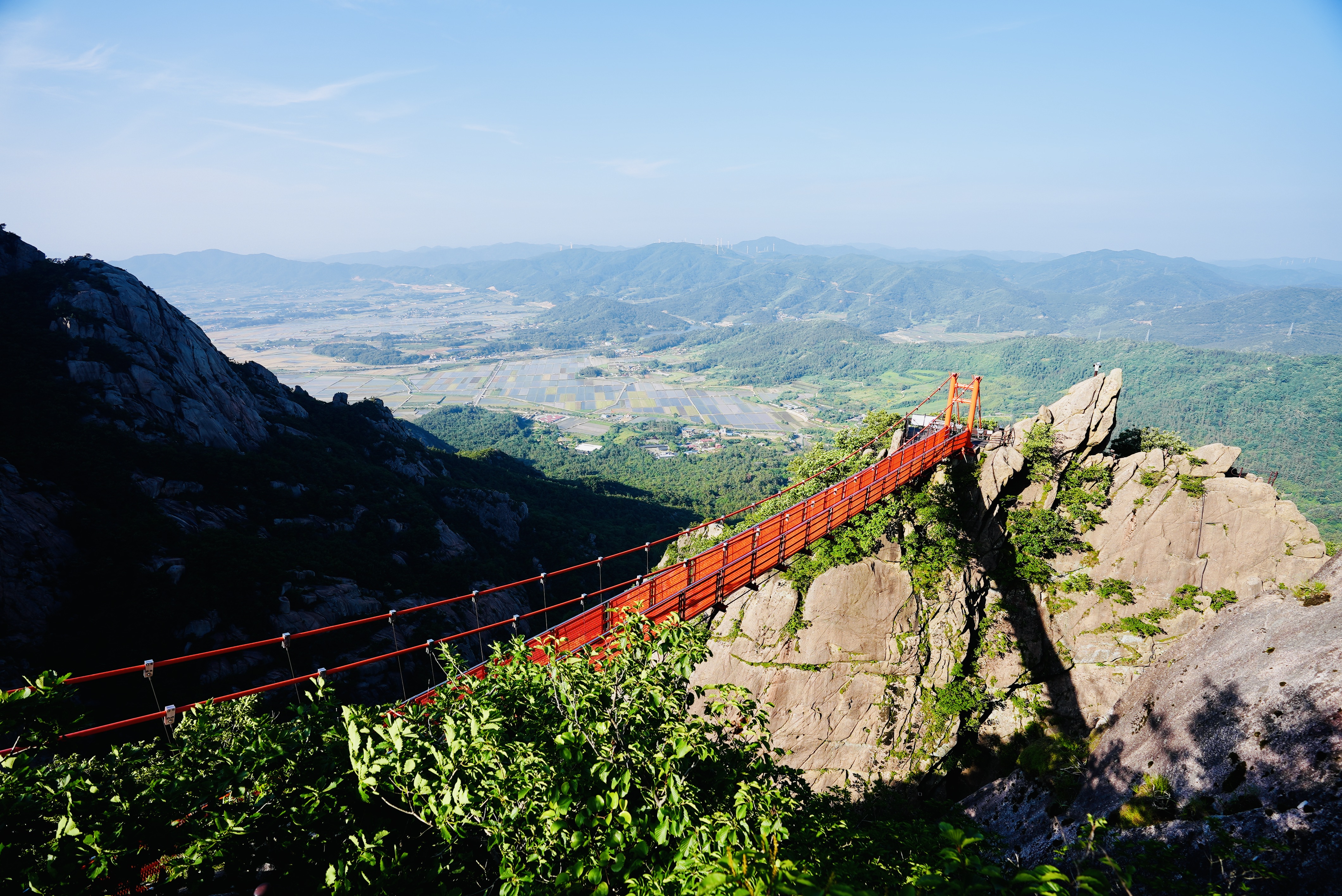 하산 후 내려온 산밑에서는 저 멀리 빨간 구름다리가 보입니다. 이것이 왜 월출산의 아이콘인지 알게 되었습니다.
