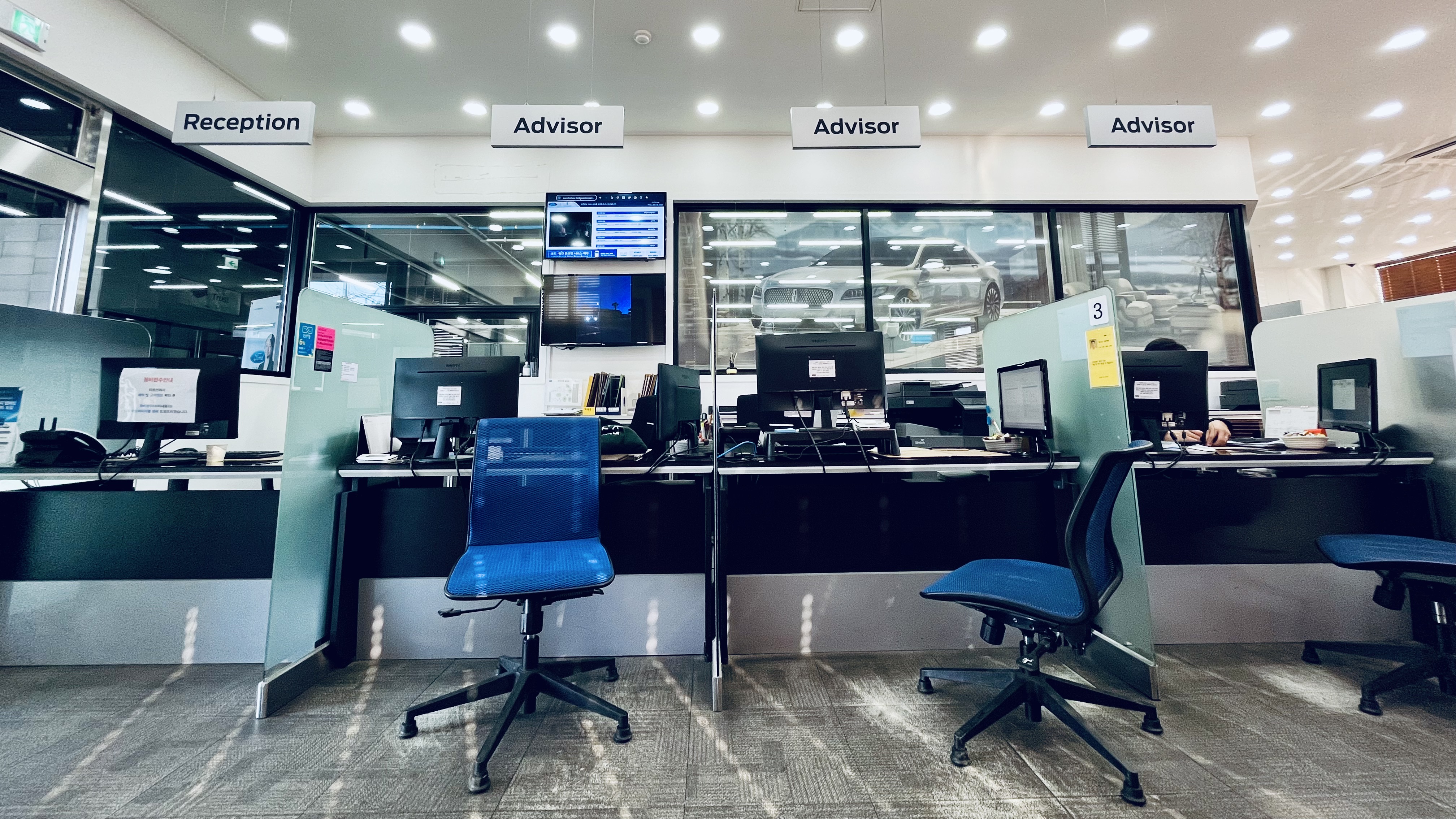 차량 구매 상담을 받을 수 있는 공간과 차량 정비 행사 및 서비스 프로그램이 적힌 간판도 보였네요.