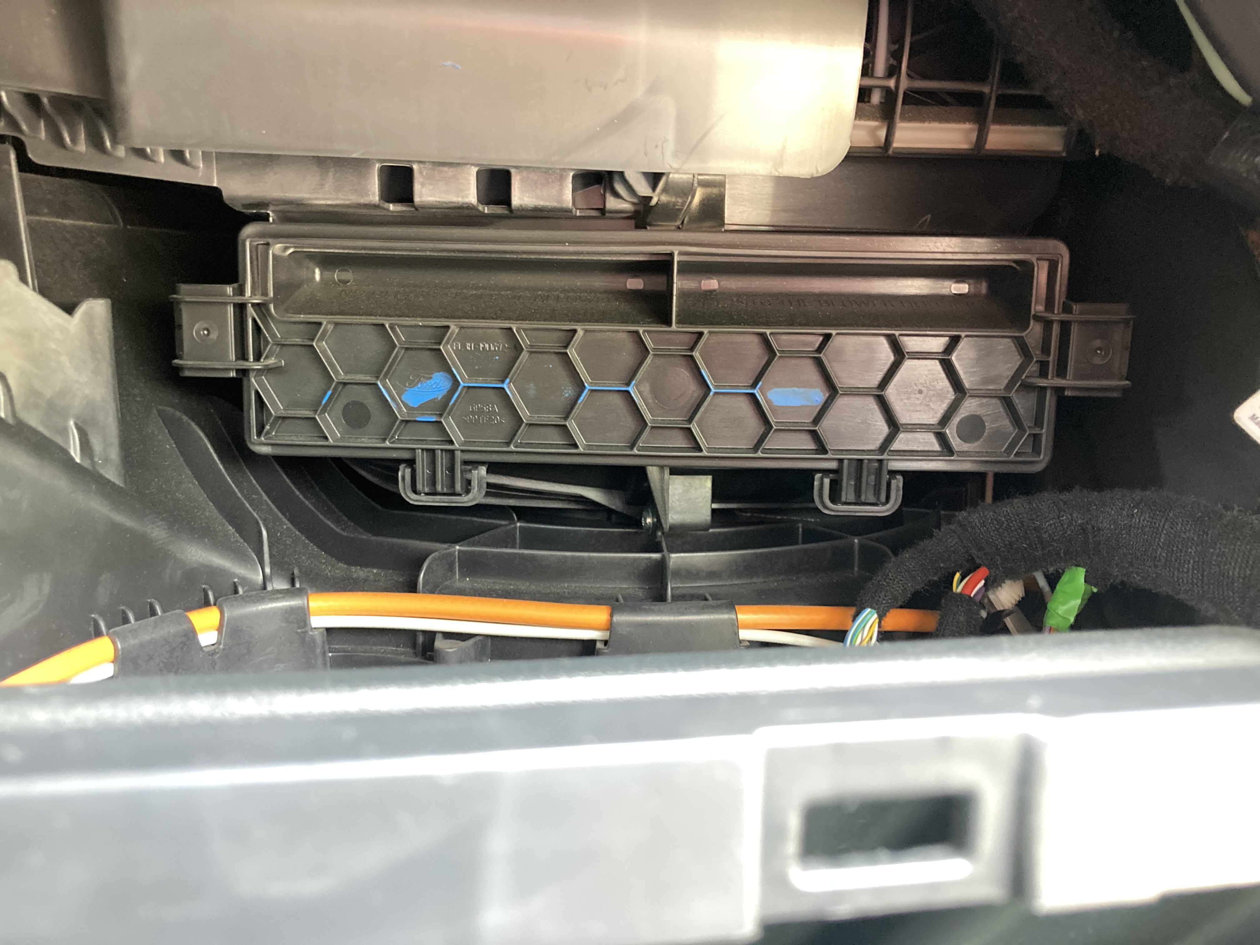 글러브 박스의 걸림 고리들을 조심씩 해체하고, 라챗으로 봉인된 캐빈 필터 진입 부품을 제거하면 내주에 필터 케이스가 나타납니다.
