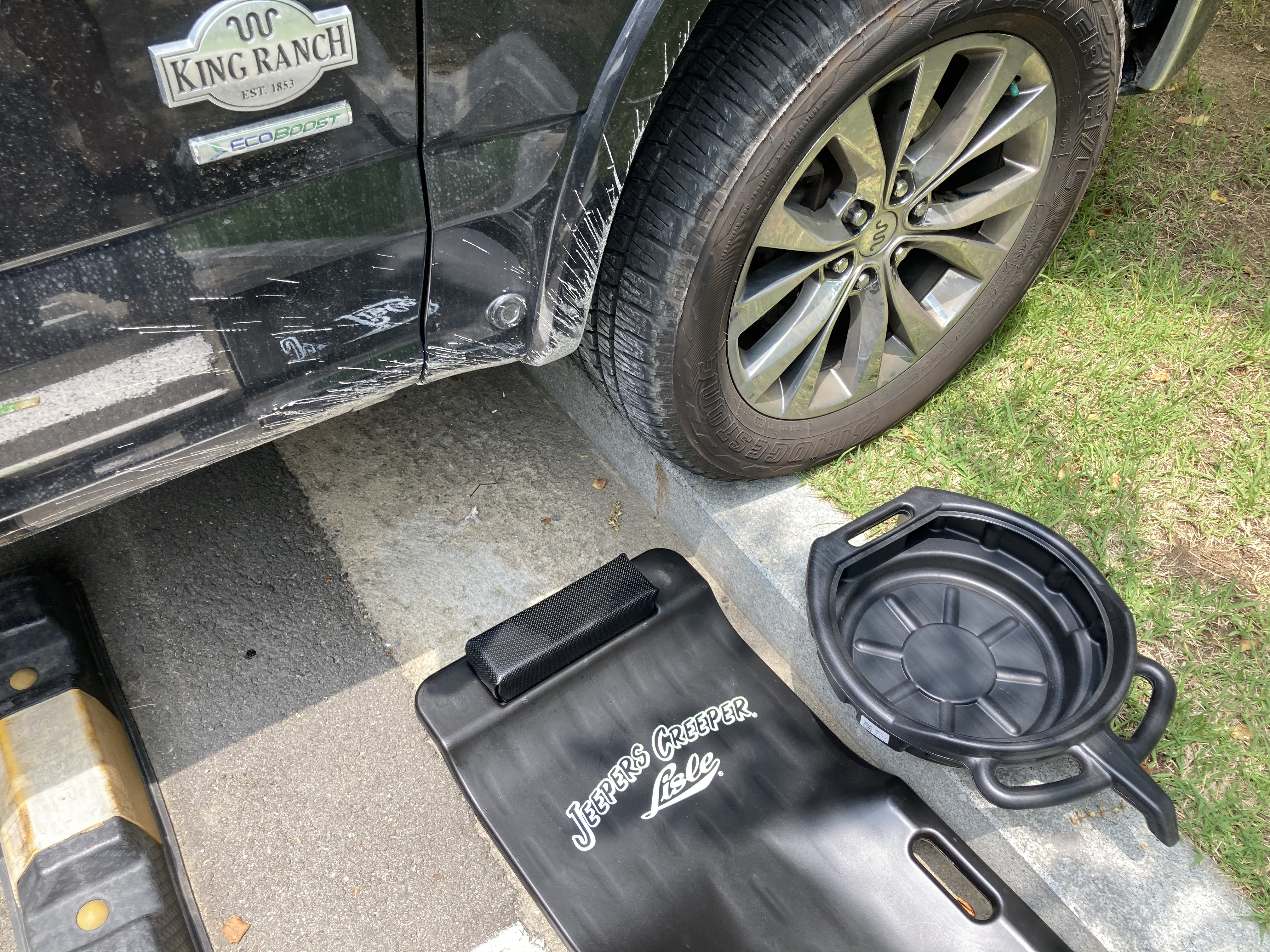 차 밑으로 들어가는데는 Lisele 사의 Jeepers Creeper가 매우 큰 도움이 되었습니다. 혹시나 싶어 앞바퀴를 턱에서 내리고 밑으로 들어가 봤는데 역시 F150은 차고가 높아 어떤 리프트도 없이 차 아래로 들어갈 수 있었습니다.