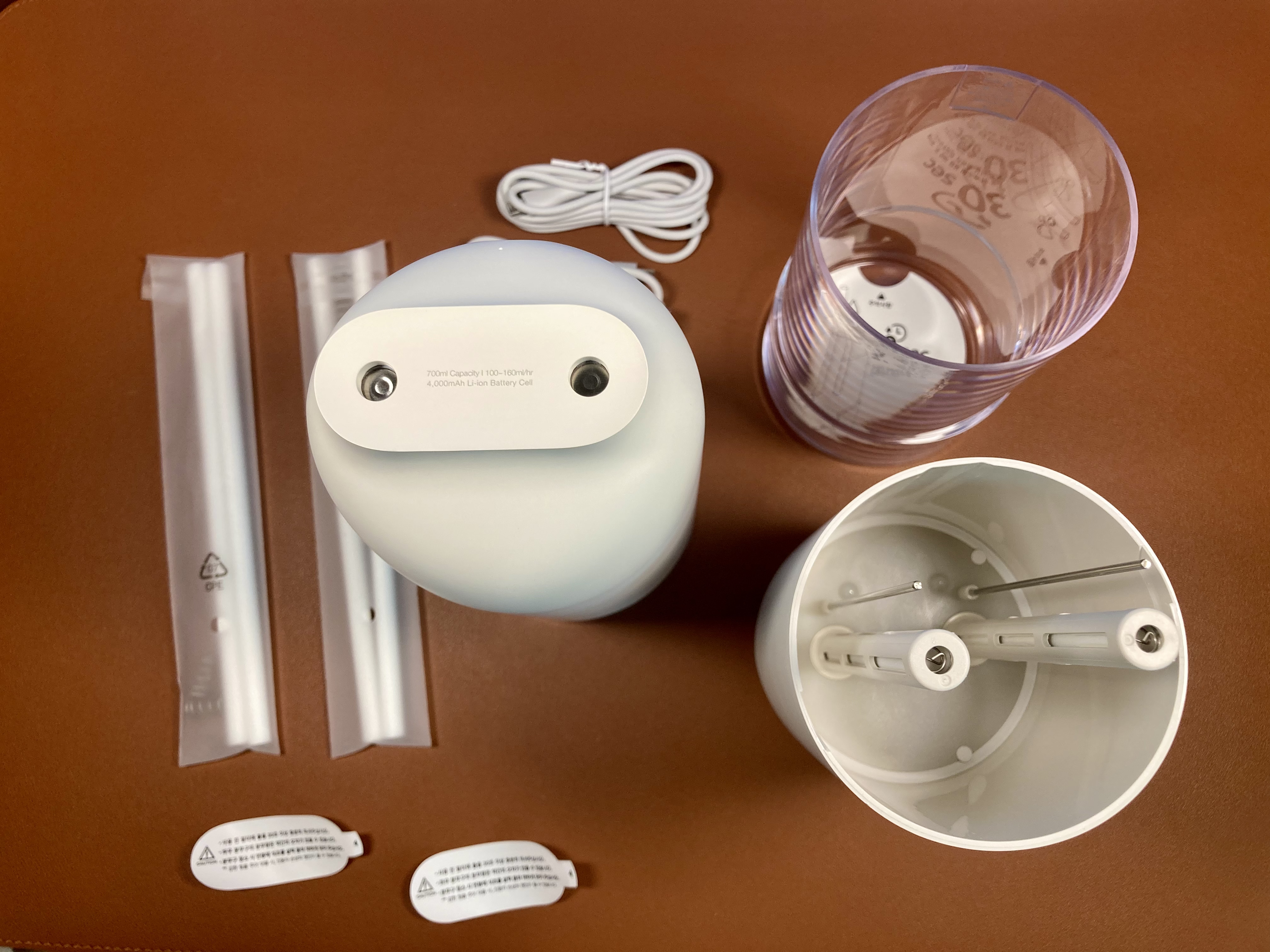이제는 더욱 다양한 색상이 추가되었네요. 수조용량 700ml입니다만, 500ml 정도만 물을 넣을 수 있도록 눈금이 있습니다. 배터리 용량은 4,000mAh. 분무량은 100ml/hr(1단계), 160ml/hr(2단계) 입니다. 무선으로 12시간(1단계), 6시간(2단계) 사용 가능합니다.