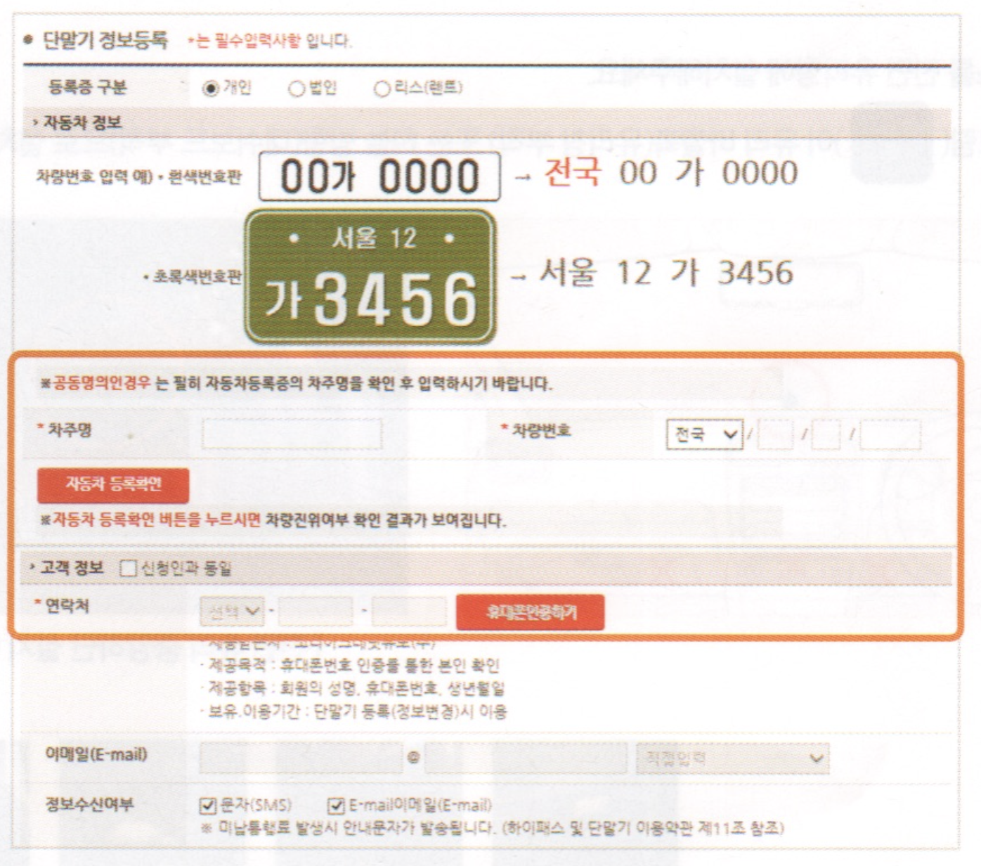 4. 차량 정보를 입력합니다. (개인 : 차주명, 차량번호, 사용자 연락처 / 법인 : 법인번호, 사업자등록번호, 차량번호, 사용자 연락처)