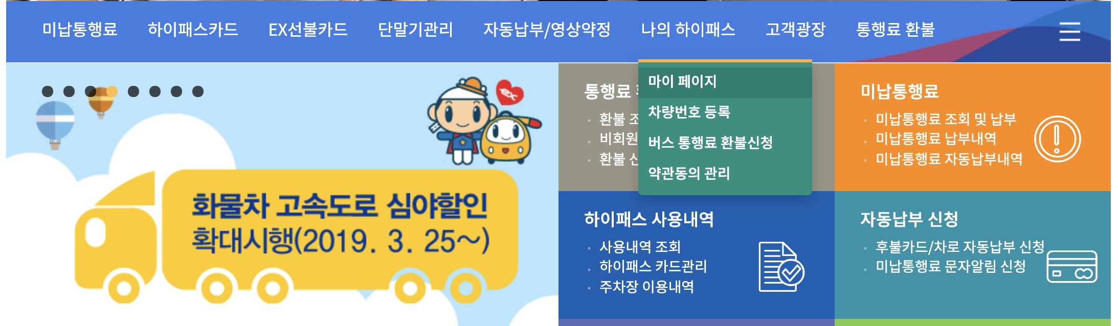 여기에서 멈추시면 안되고, 앞서 신청한 신용카드를 등록해야 합니다. 아래처럼 '나의 하이패스'에서 '마이 페이지'로 갑니다.