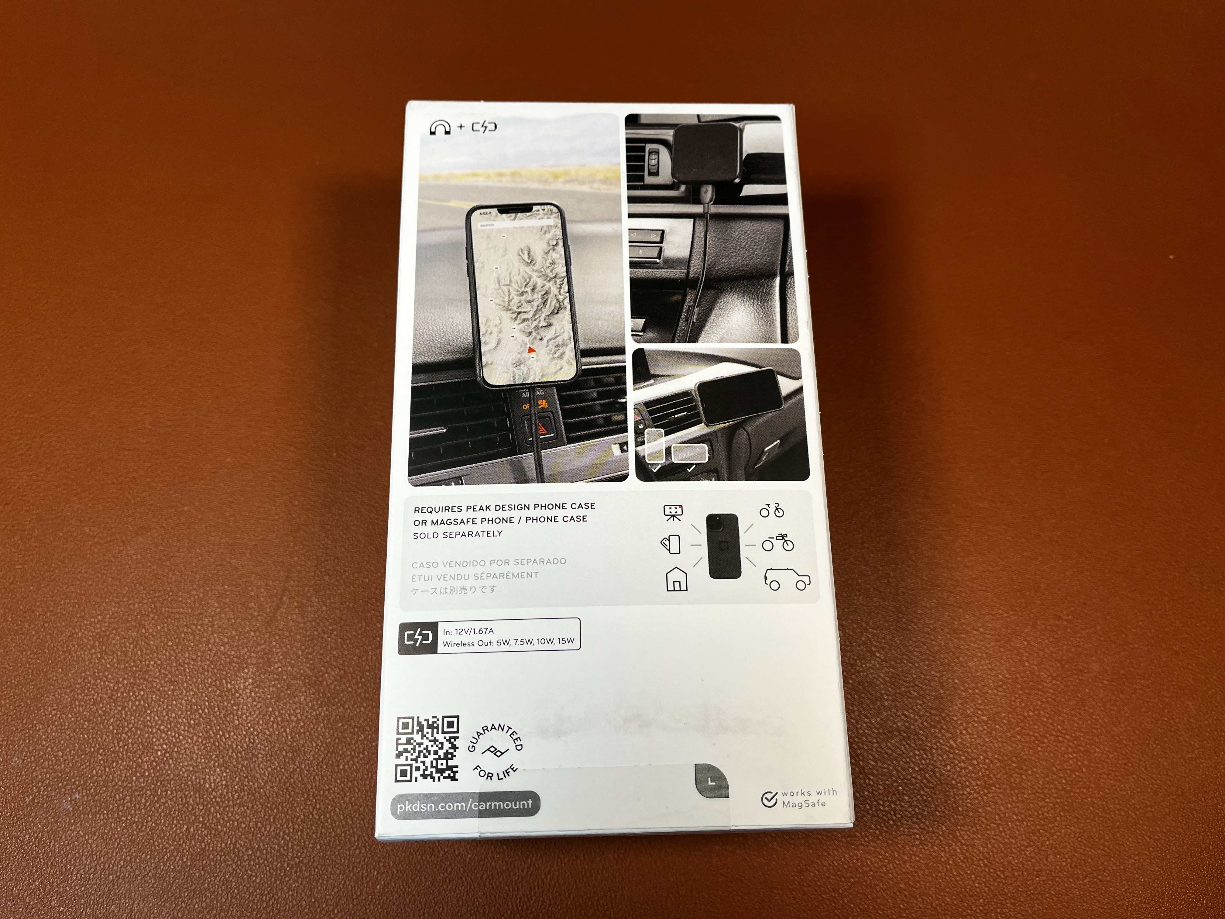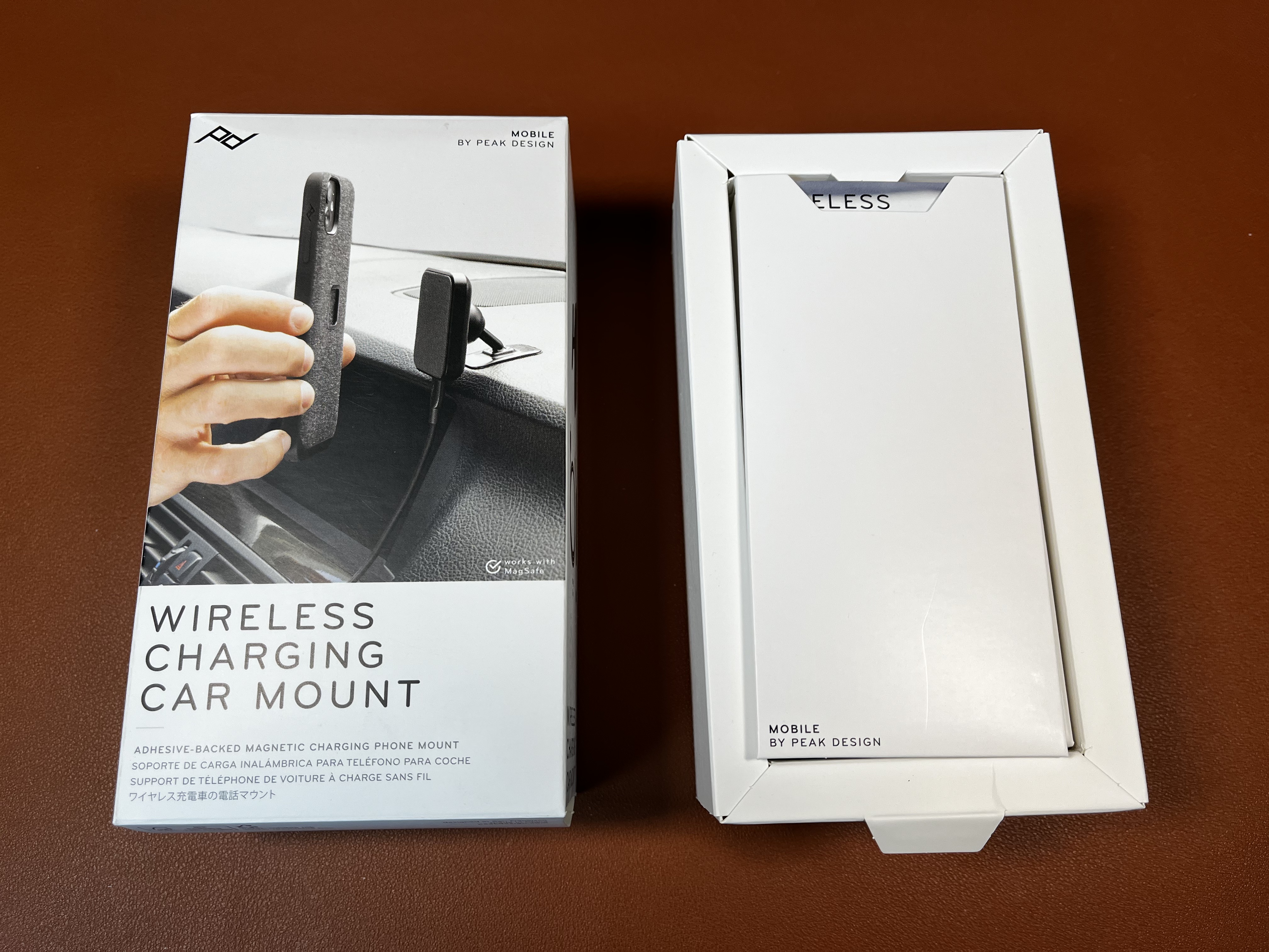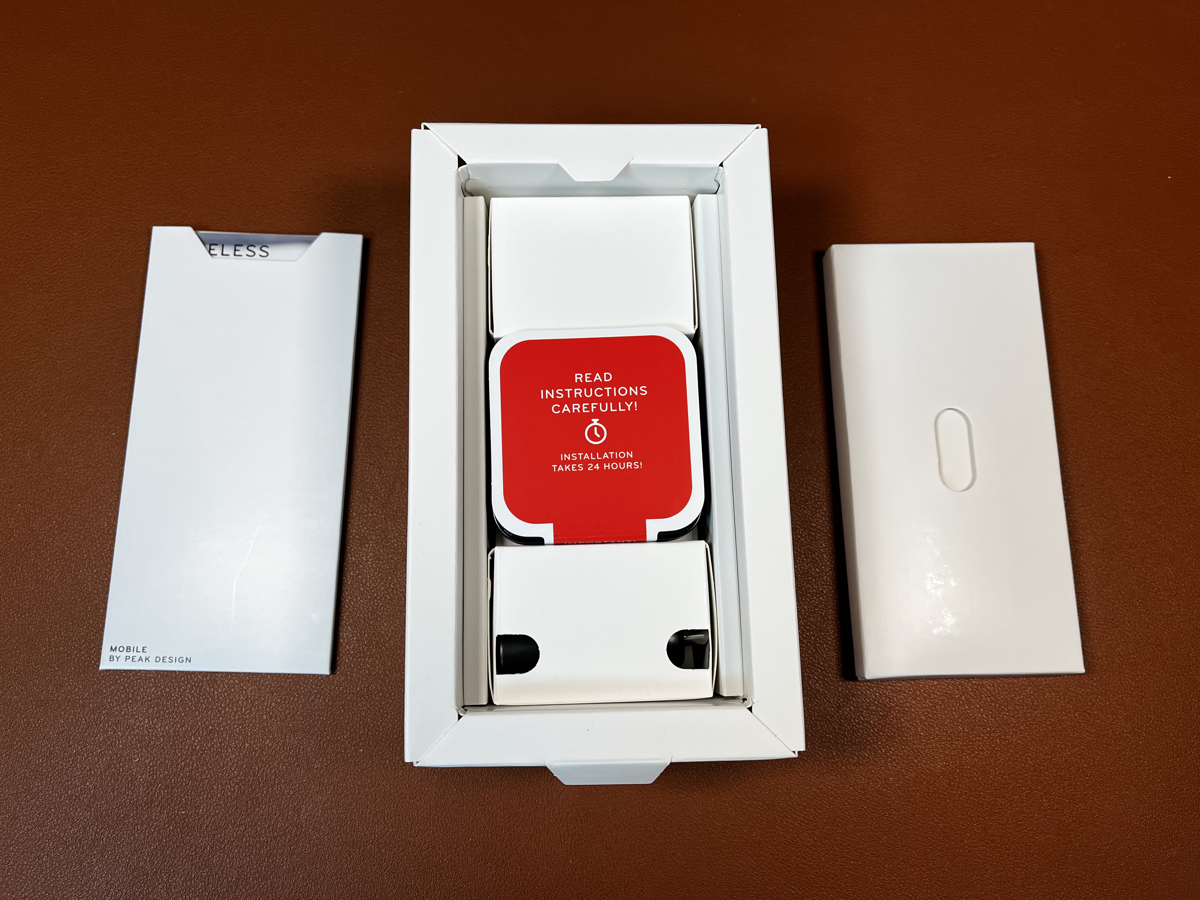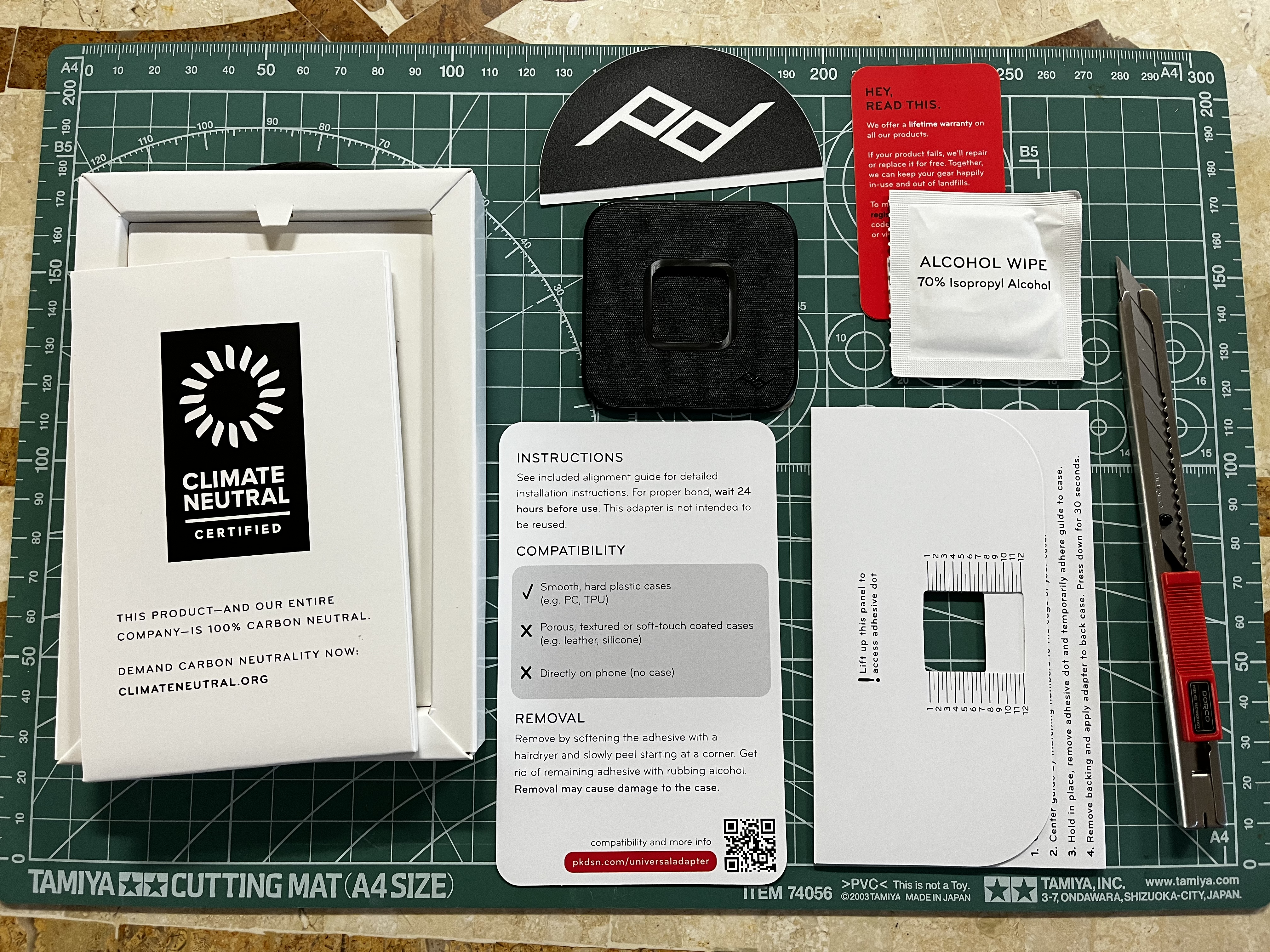 충전 거치대는 아노다이징 알루미늄으로 가공되어 있고 볼헤드가 있습니다. 3M VHB 접착테이프로 차량에 고정합니다. 거치면은 Tinuvin 770 UV 안정제가 적용되어 미끄러지지 않는 실리콘 패드가 마련되어 있고 여기에 강력한 네오디뮴 마운팅 자석이 Peak Design Cases 및 MagSafe 휴대폰/케이스를 고정하게 됩니다.