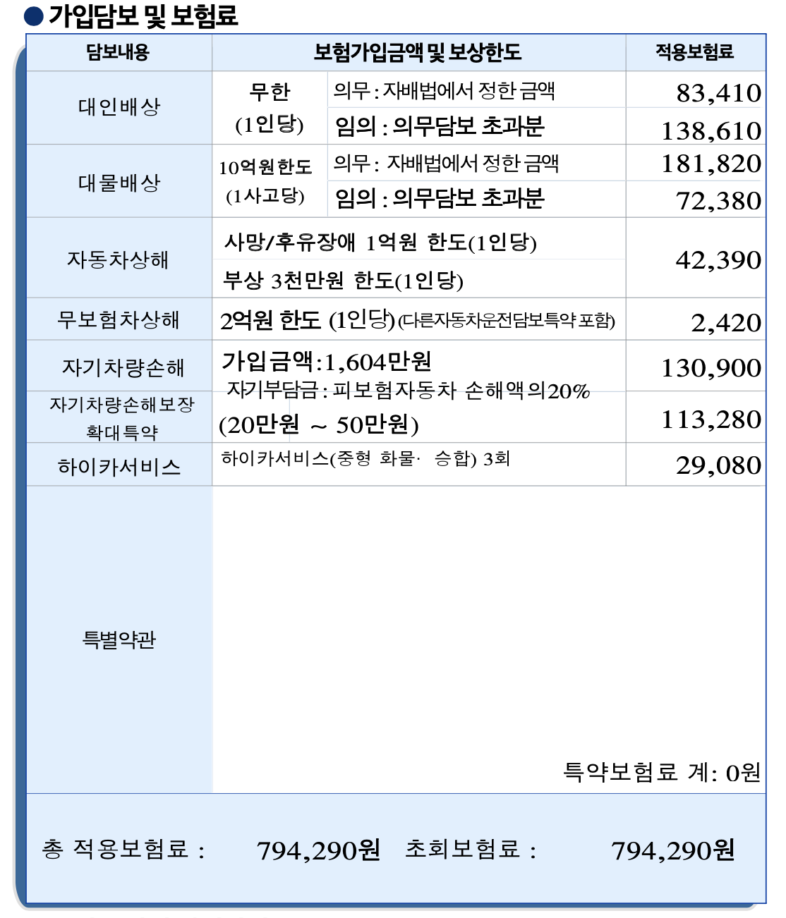 가입금액:1,604만원 자기부담금:피보험자동차 손해액의20%