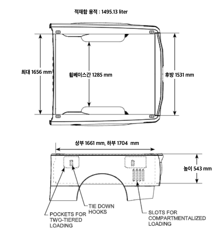 적재함 크기, 1704 x 1285 x 543 mm