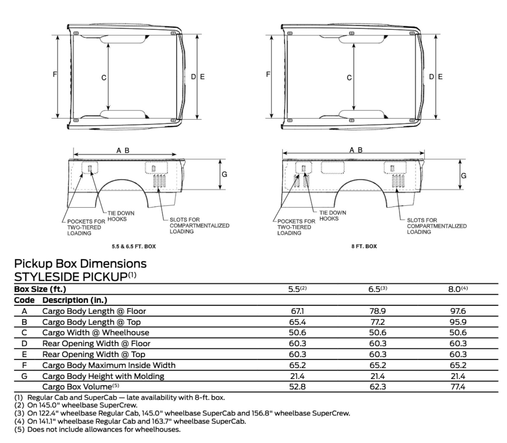 특별한 옵션을 선택하지 않는 이상 F150의 적재함 크기는 5.5피트를 기본으로 합니다. 그래서 아래 사진의 왼쪽 사이즈, 그리고 아래 표의 5.5 피트에 해당하는 열입니다.