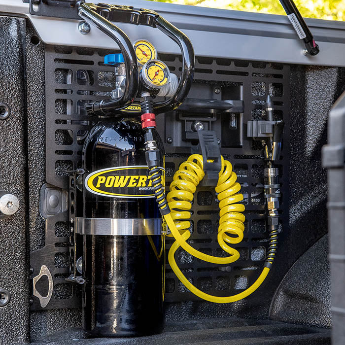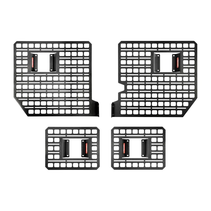 이는 트럭 적재함 측면에 금속으로 된 MOLLE (Modular Lightweight Load-carrying Equipment) 패널을 제공합니다.