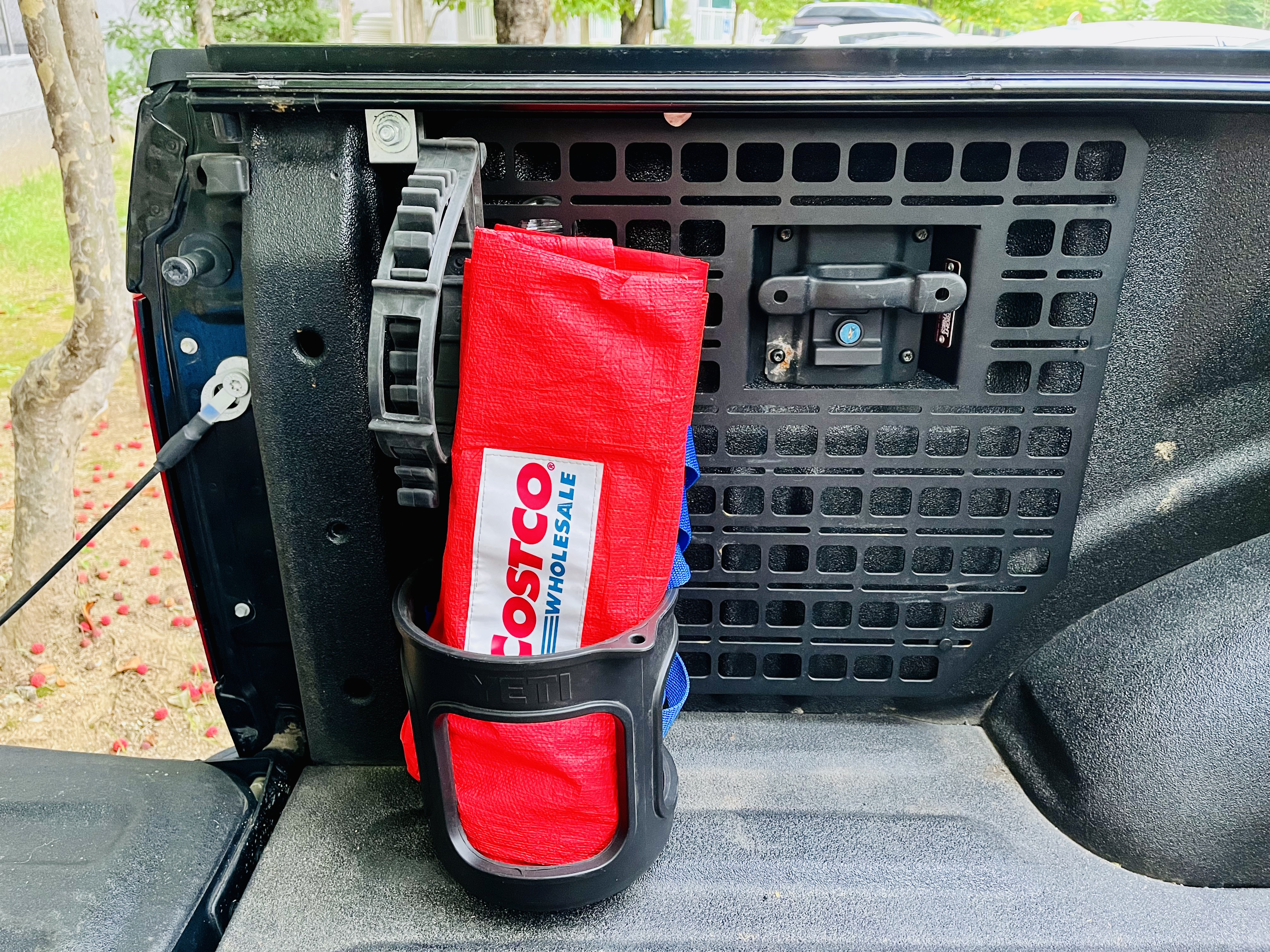 아래는 과거 BuiltRight 트럭 베드 MOLLE (Modular Lightweight Load-carrying Equipment) 패널을 통해 고정해두었던 왼쪽 부위입니다. YETI 저그 마운트를 뉘워 설치했던 이유는 물따르기를 편리하게 하기 위함이었는데, 그다지 실용적이지 않았습니다. 물을 쏟을까 조마조마해졌기 때문에 정립자세로 바꾸는 것이 낫겠다는 생각입니다. 또한 이런 상단 설치는 MOLLE 패널을 고정시키기 위한 나사 체결부가 하단 후방부에 있어 여기에 방해가 되면 패널 설치에 어려움이 있었고, 이 부위에 스탠리 물병을 설치하면 되겠다는 다소 강박적인 구성이이었습니다.