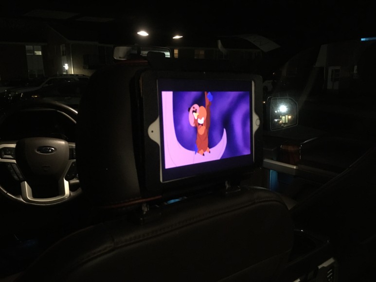 뒷자리에 앉은 아이들의 영화 시청을 위해 아이패드 미니 2대를 사용하고 있습니다.