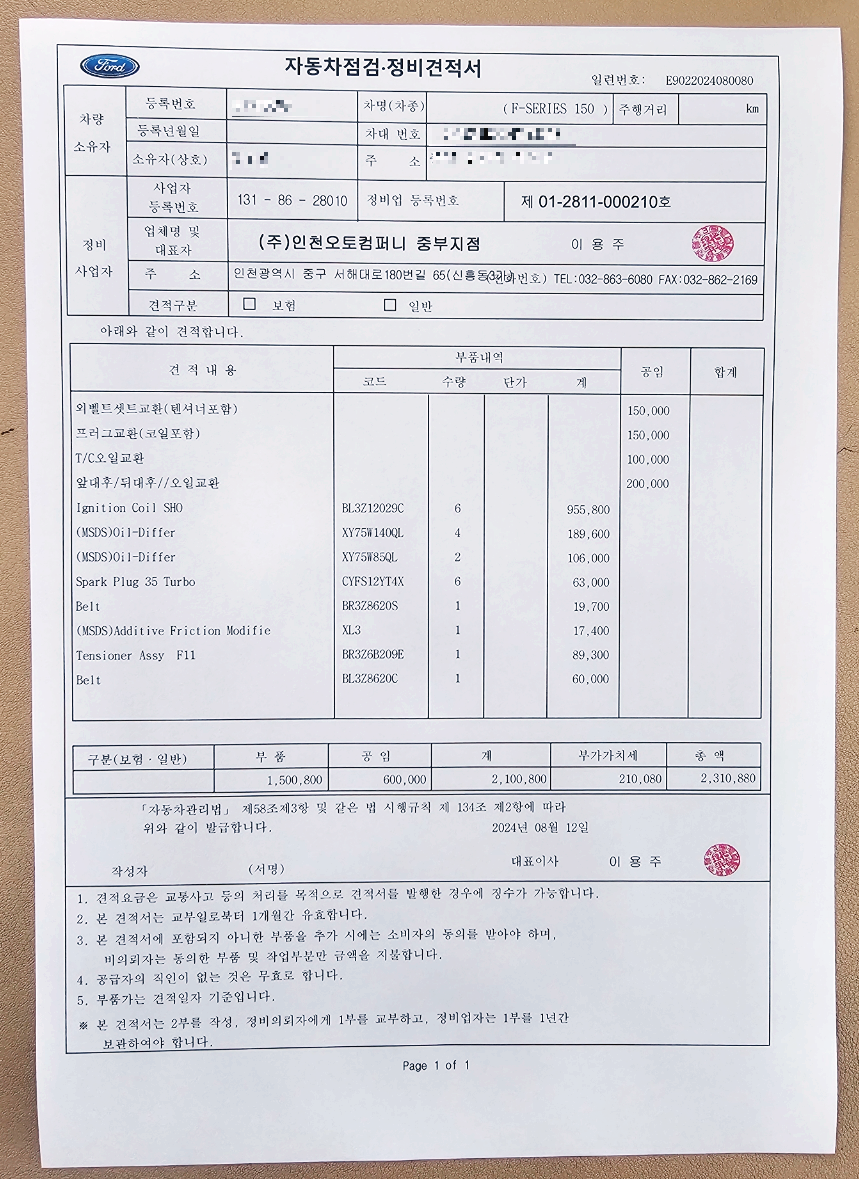 | 견적내용 | 부품내역 | 공임 | Ford OEM | 비고 | |||