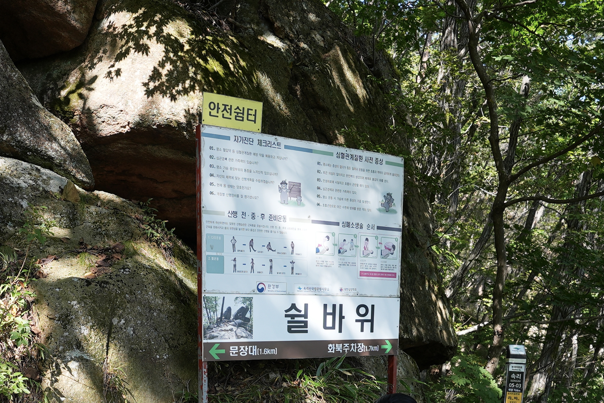 급격히 가팔라지는 경사에 놀라며 오르면 쉴 바위라는 곳이 나타납니다.