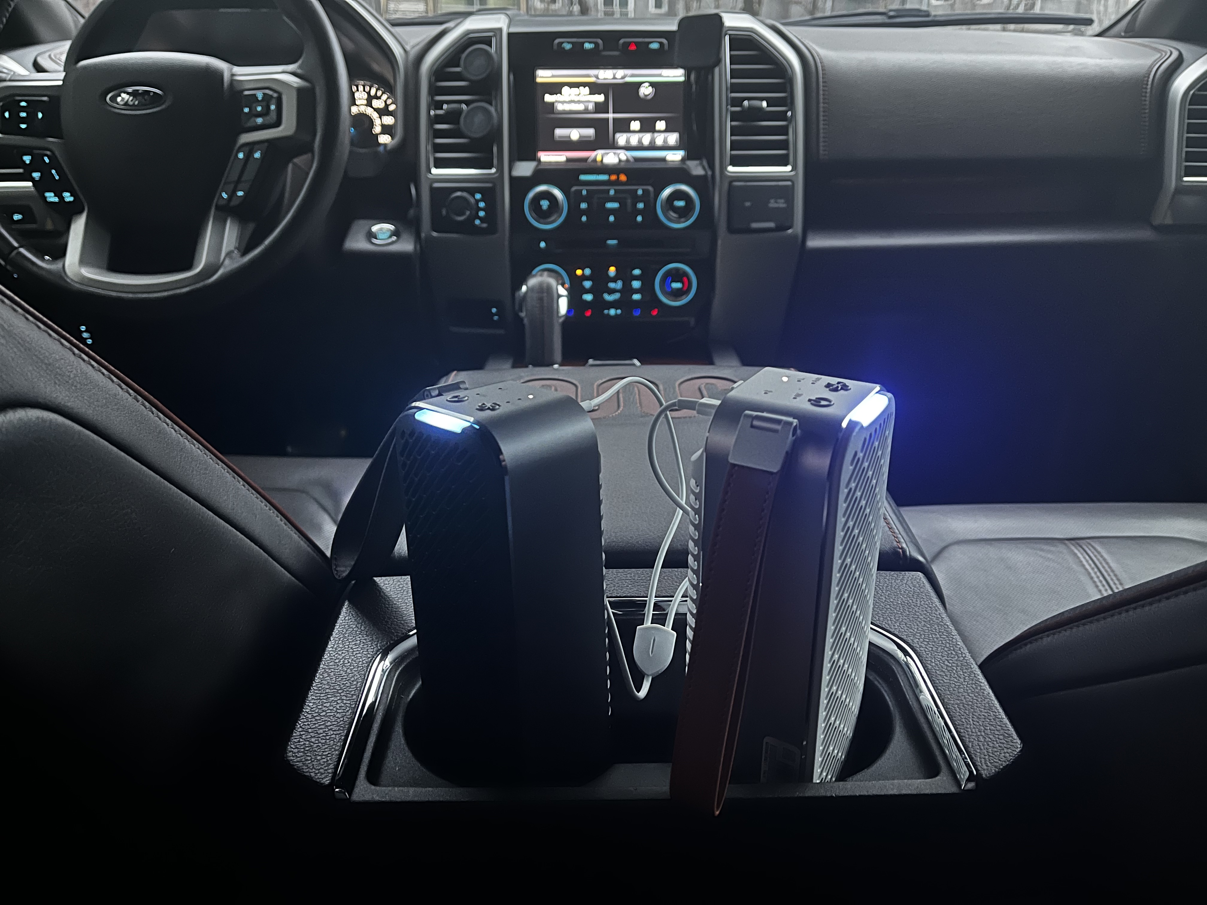 이 제품은 F150의 컵홀더에 딱맞게 들어가는 사이즈를 갖고 있습니다. 크기(WxHxD) 69x200x64mm, 무게 530g입니다. 특히 아래 사진처럼 센터 콘솔에 넣어두면 차량 정중앙에서 미세먼지 제거를 진행하게 됩니다.