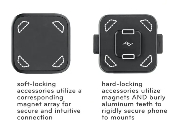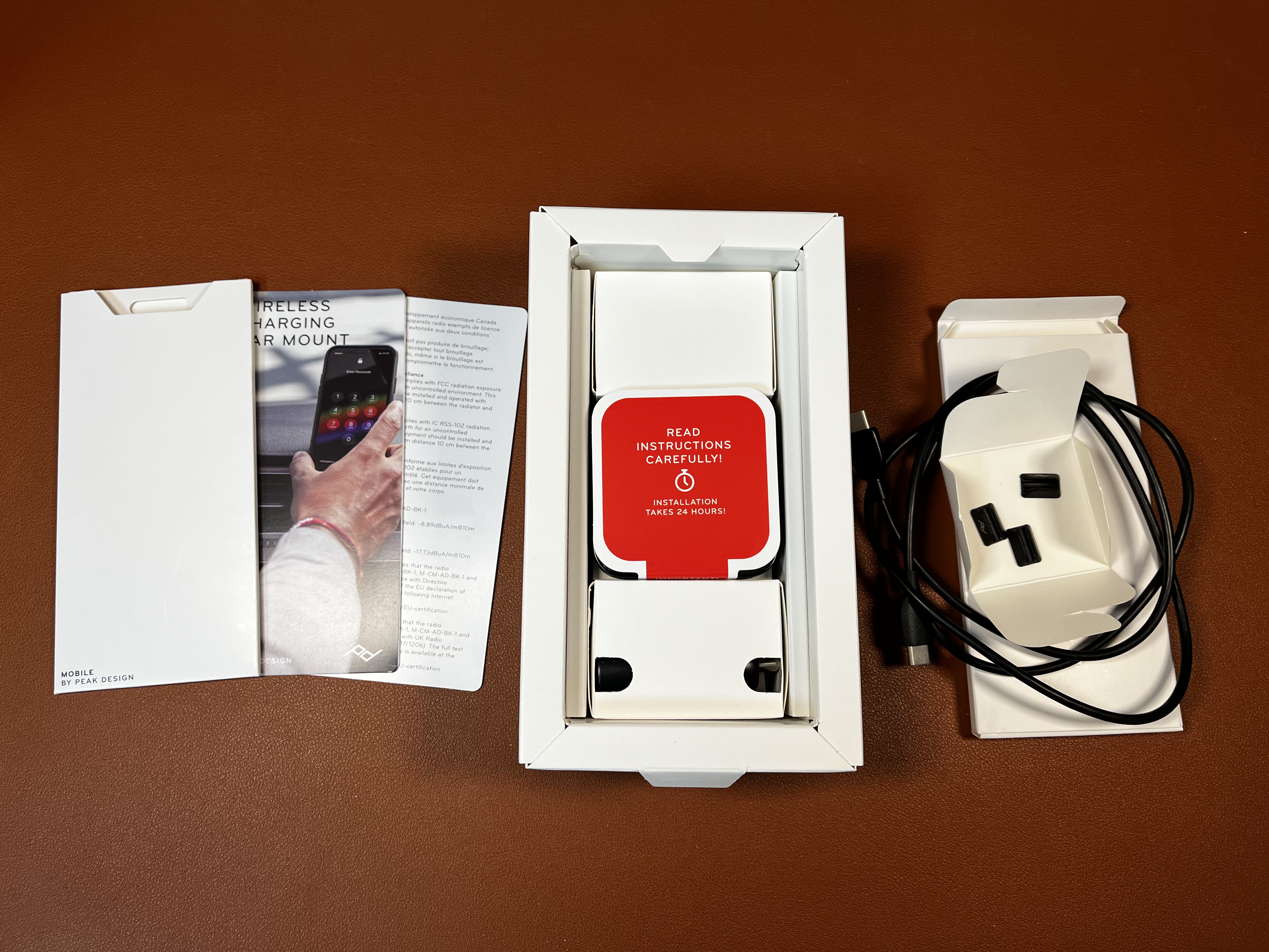 충전 거치대는 아노다이징 알루미늄으로 가공되어 있고 볼헤드가 있습니다. 3M VHB 접착테이프로 차량에 고정합니다. 거치면은 Tinuvin 770 UV 안정제가 적용되어 미끄러지지 않는 실리콘 패드가 마련되어 있고 여기에 강력한 네오디뮴 마운팅 자석이 Peak Design Cases 및 MagSafe 휴대폰/케이스를 고정하게 됩니다.